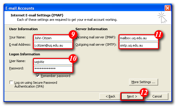 12)Click [More Settings], then Select the 'Outgoing Server ' tab. Tick the 'My outgoing server (SMTP) requires authentication' checkbox. Place a dot in the 'Use the same settings as my incoming mail server' option. Click the [OK] button. Click [Next] to